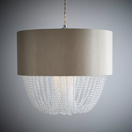 Grey Fabric Ceiling Pendant Light shade with Cascading Acrylic Bead Droplet Design