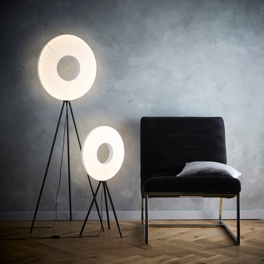Riley LED Tripod Floor Lamp or Table Lamp with White Fabric Shade and black tripod legs