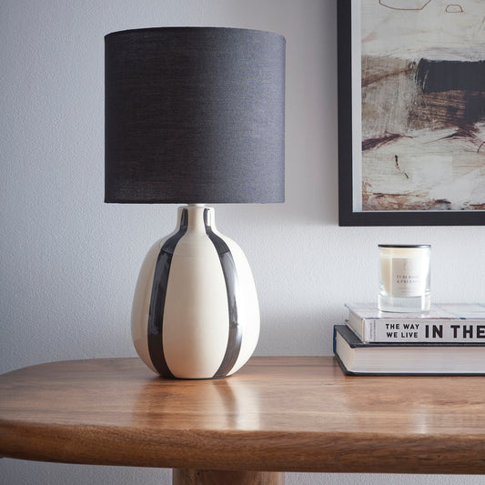 Painted Striped Ceramic Table Lamp with a round base and Matching shades, in Black, Blue, Green and Grey Colour options