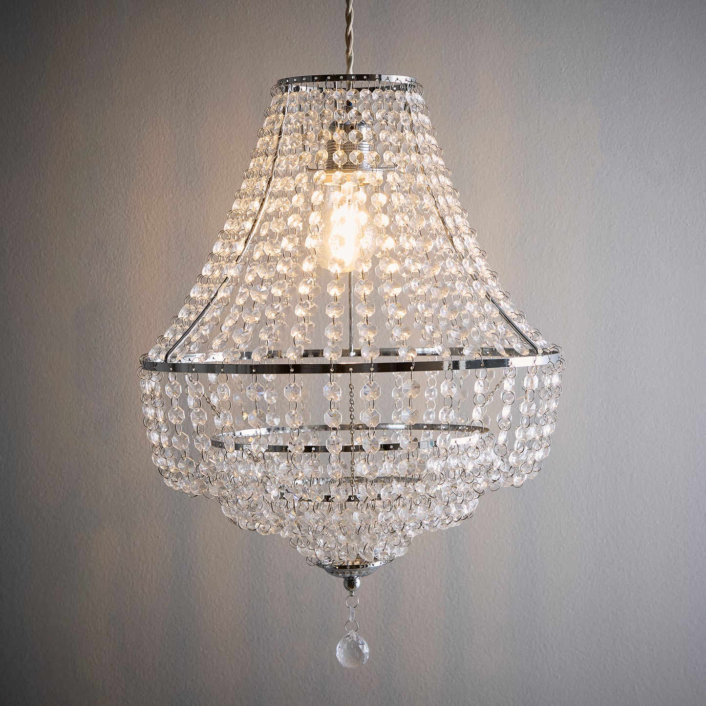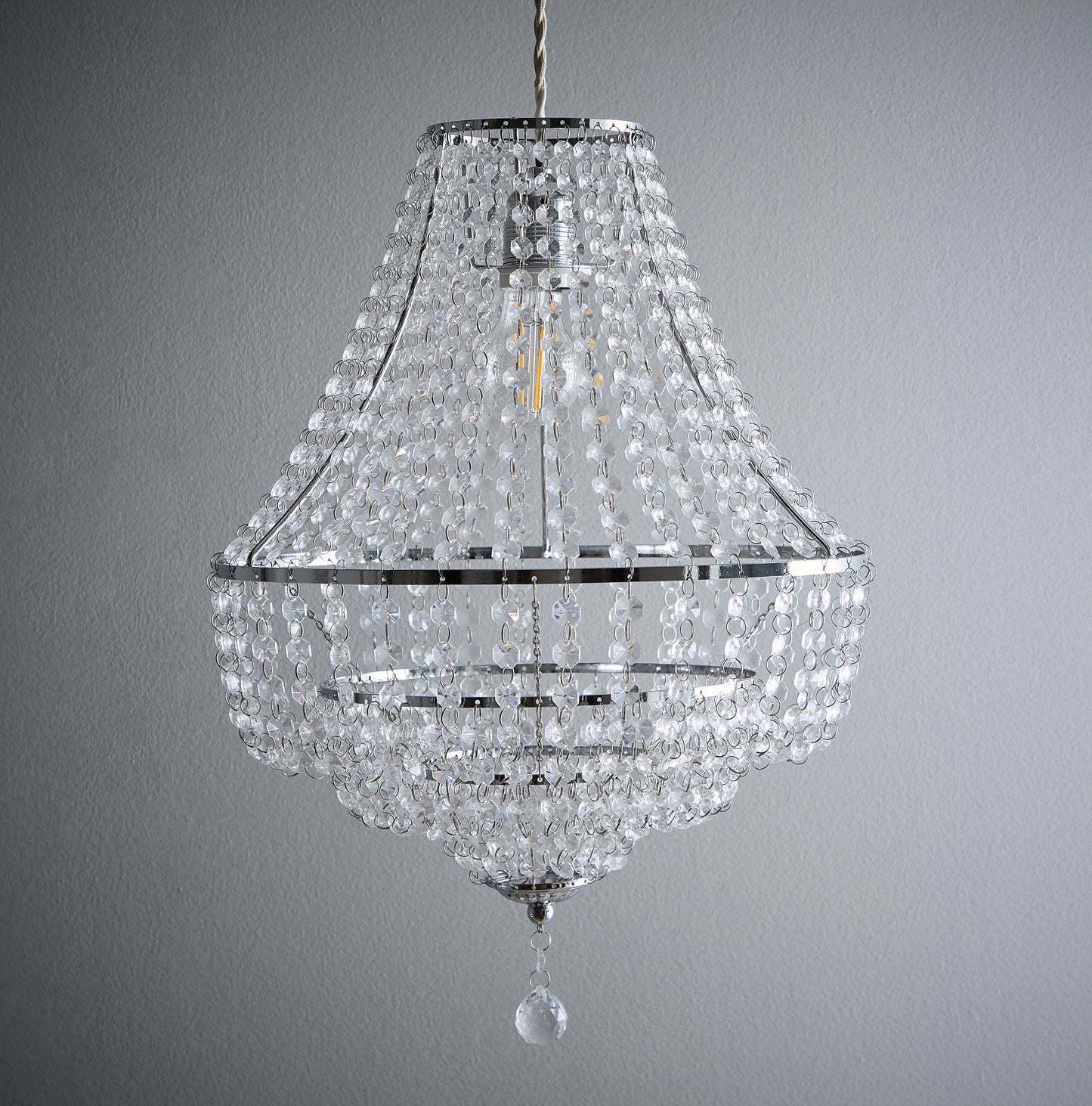 This exquisite three-tier pendant, finished in chrome and adorned with acrylic beads, captures the essence of a classic chandelier.